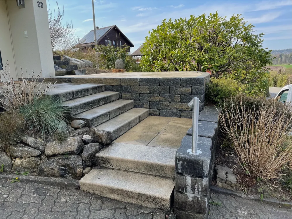Aus einem verwitterten, pflegeintensiven Plätzchen entstand ein moderner, langlebiger Aussenbereich mit stilvoller Steinmauer.